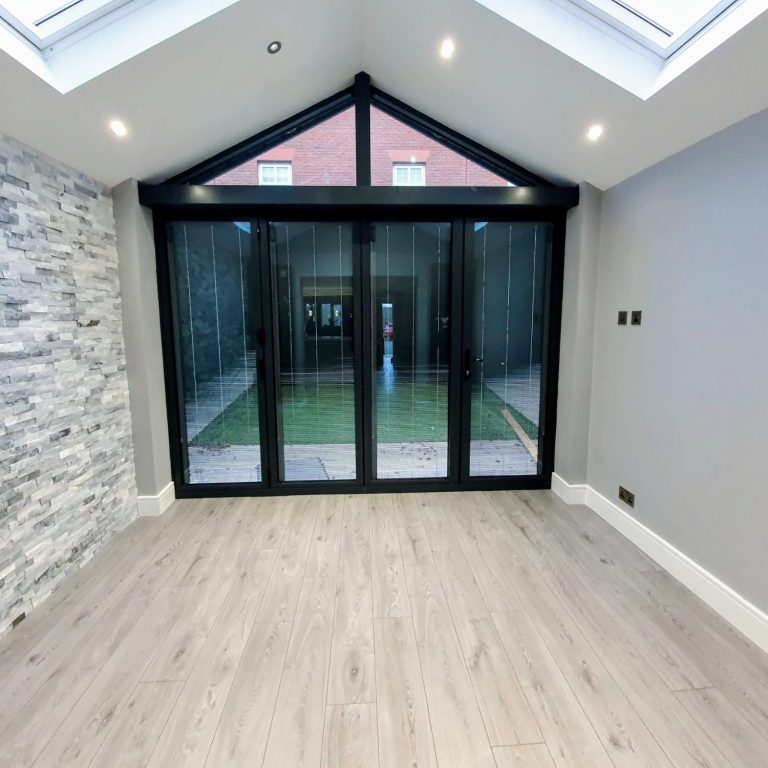 Single story extension built to rear of property. This incorporated a vaulted ceiling with electric Velux windows and bi-fold doors.